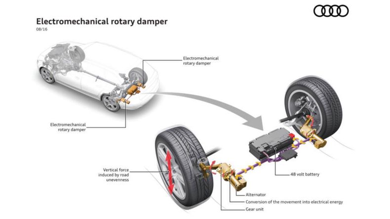 Każdy wybój, każda dziura, każda krzywa przyczynia się do powstawania energii kinetycznej w samochodzie. Obecnie, amortyzatory pochłaniają tę energię, zamieniając ją w ciepło. Dzięki nowemu, elektromechanicznemu zawieszeniu i 48-woltowej instalacji elektrycznej możliwe jest jej wykorzystanie