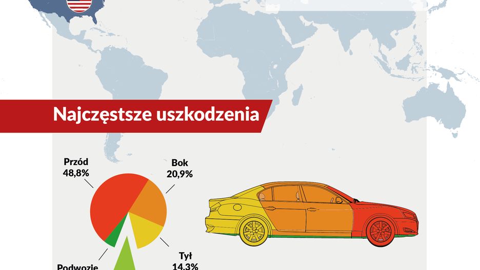 Jak wynika z analizy rodzajów uszkodzeń dla aut zweryfikowanych za pośrednictwem autoDNA pochodzących z USA i sprowadzonych do Polski, najczęściej mamy do czynienia z mechanicznymi uszkodzeniami nadwozia - stanowią one ponad 85% wszystkich defektów samochodów z Ameryki. Najpowszechniej występują uszkodzenie nadwozia z przodu (42,2%), jednego lub obu boków (21%) lub tyłu (14,3%). Uszkodzenia więcej niż 1 obszaru (tzw. all over) to jedynie 2,7% aut, ale już usterki podwozia zdarzają się w 5% przypadków. Jedynie 4,8% to usterki mechaniczne, np. defekty silnika czy skrzyni biegów.