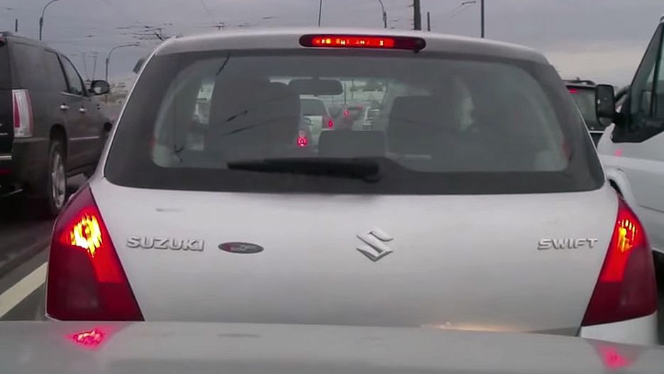 Pani zasiadająca za kierownicą Suzuki Swifta była czymś zajęta na tyle, że nie zauważyła, że stoczyła się na auto stojące za nią. Za stłuczkę obwinia kierowcę poszkodowanego. Dobrze, że miał wideorejestrator, w przeciwnym wypadku trudno byłoby mu udowodnić winę kobiety.