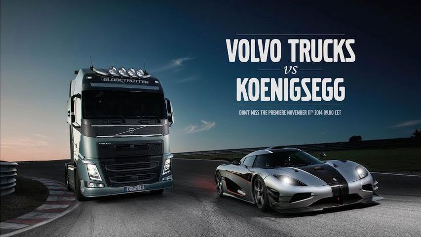 Volvo Trucks po raz kolejny zamierza zaprezentować zalety swoich produktów w niekonwencjonalny sposób. Aktywny układ kierowniczy był promowany przez klipy, w których mogliśmy oglądać chomika "kierującego" wywrotką oraz Jeana-Claude'a Van Damme'a robiącego szpagat za podstawę dla nóg mając jadące na wstecznym ciężarówki. Najnowszy pomysł to pojedynek pomiędzy Volvo FH i Koenigseggiem One:1 na szwedzkim torze Knutstorp. Film z wyścigu pomiędzy pojazdami zostanie opublikowany 11 listopada. Za kierownicą ciężarówki zasiądzie były kierowca wyścigowy i prezenter Fifth Gear Tiff Needell. Tym razem chodzi o pokazanie plusów dwusprzęgłowej przekładni Volvo I-Shift.