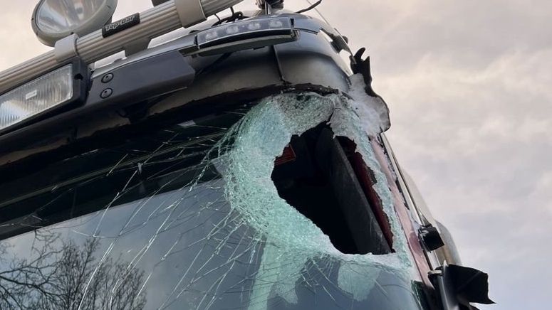 Podczas mijania się dwóch ciężarówek na zakręcie, tafla lodu z naczepy jednej z nich uderzyła w przednią szybę drugiego pojazdu i wpadając do środka, raniła kierowcę w twarz. Poszkodowany mężczyzna został natychmiast przewieziony do szpitala, gdzie otrzymał niezbędną pomoc medyczną. Na szczęście jego życiu nie zagraża żadne niebezpieczeństwo. Kierowca, który nie dostosował swojego pojazdu do warunków drogowych, stanie przed sądem.