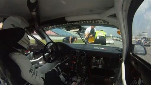 Na video poniżej widzimy kierowcę wyścigowego - Ronald van de Laar. Siedzi w swoim 911 i przygotowuje się do wyścigu w serii ADAC GT Masters. Na ujęciu widać doskonale dziewczynę, hostessę, jedną z tych które trzymają tablicę z nazwiskiem kierowcy. Dziewczyna - zapewne pod wpływem gorąca - postanowiła delikatnie sobie zemdleć. Zrobiła to z wielką gracją, kładąc się na masce szalenie drogiego Porsche.