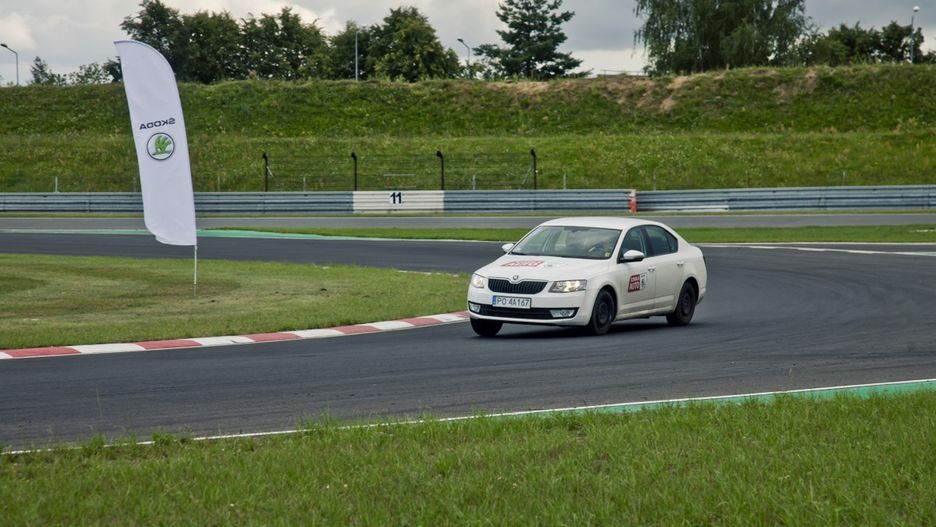 Po zakończeniu krótkiej wycieczki po Škoda Auto Lab przejechaliśmy na oddalany o kilkanaście kilometrów Tor Poznań, celem rozpoczęcia właściwego szkolenia, na które składało się sześć różnych prób sprawnościowych. Po krótkiej odprawie i podziale na grupy każda udała się na swoje ćwiczenia. Pierwszym zadaniem był trening hamowania awaryjnego z różnymi prędkościami początkowymi, na różnych nawierzchniach i różnymi autami. Na kursantów w tej sekcji czekały Škoda Roomster, Octavia i Rapid.