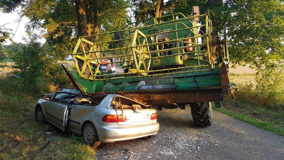 Zderzenie samochodu osobowego z kombajnem zazwyczaj nie kończy się dobrze. 24-latek jadący hondą civic może więc mówić o dużym szczęściu. Choć dach w aucie dosłownie zniknął, kierowca wyszedł z wypadku bez szwanku.