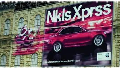 Na taki właśnie pomysł wpadło BMW reklamując najnowszy model serii 1 zestawiając go wraz z obrazkiem mikołaja. Reklama taka zawisła w Hamburgu i jak widać na załączonym obrazku zostały z niej wycięte samogłoski, co może być symbolem szybkości auta. Gdyby je umieszczono, moglibyśmy przeczytać "Mikołajowy Ekspres". Pewnie prawdziwa Mikołajowa wersja to model 135i kabriolet - 3 litrowy, turbo doładowany silnik o mocy 300KM.