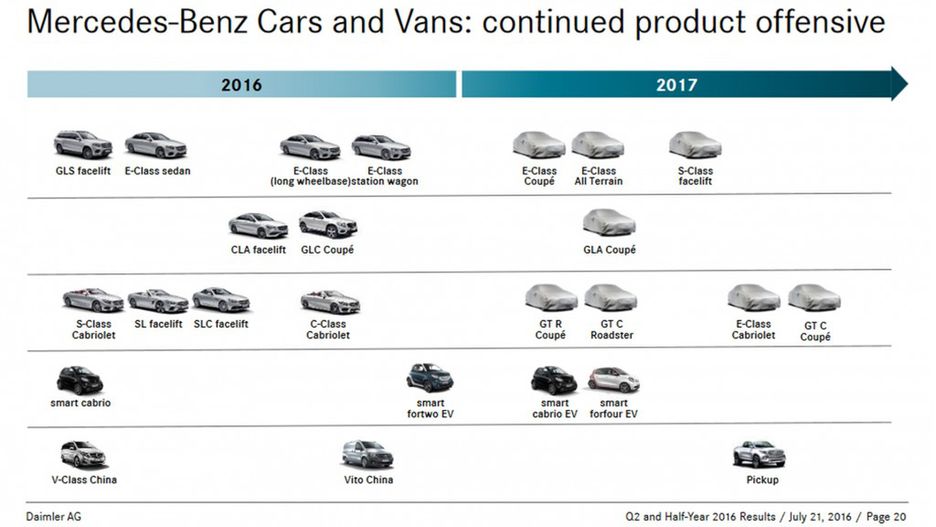 Poniżej mamy gamę elektrycznych Smartów, a jeszcze niżej długo już oczekiwanego pick-upa. Samochód powstanie we współpracy z Aliansem Renault-Nissan, a niektóre elementy mają pochodzić z Navary. Dlaczego do tej pory nie zaprezentowano samochodu? Ponieważ to będzie zupełnie inny model, a nie Navara ze znaczkiem Mercedesa jak Citan i Renault Kangoo. Niemiecka firma chce jako pierwsza zaprezentować europejskiego, luksusowego pick-upa klasy premium, więc auto ma jeździć i wyglądać jak Mercedes. W sieci zaczynają się pojawiać pierwsze, szpiegowskie fotografie, więc pewnie pod koniec roku zaczną „wyciekać” zdjęcia wersji produkcyjnej.