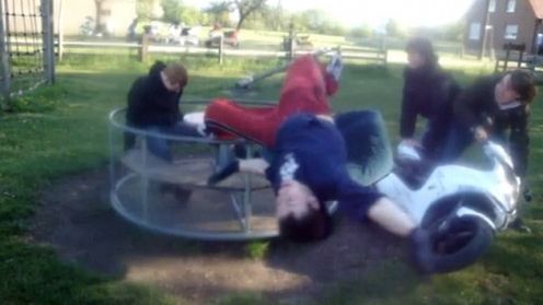 Dwóch panów rozsiadło się wygodnie na dziecięcej karuzeli. Jako że taką zabawkę trzeba jakoś napędzać wpadli na genialny pomysł użycia skutera! Ustawili motocykl w odpowiedniej pozycji, tak aby wprawiał karuzelę w ruch. Rzecz jasna panowie nie mogli skończyć na malutkich obrotach, zatem podkręcali gaz. Co z tego wynikło zobaczycie na załączonym video.