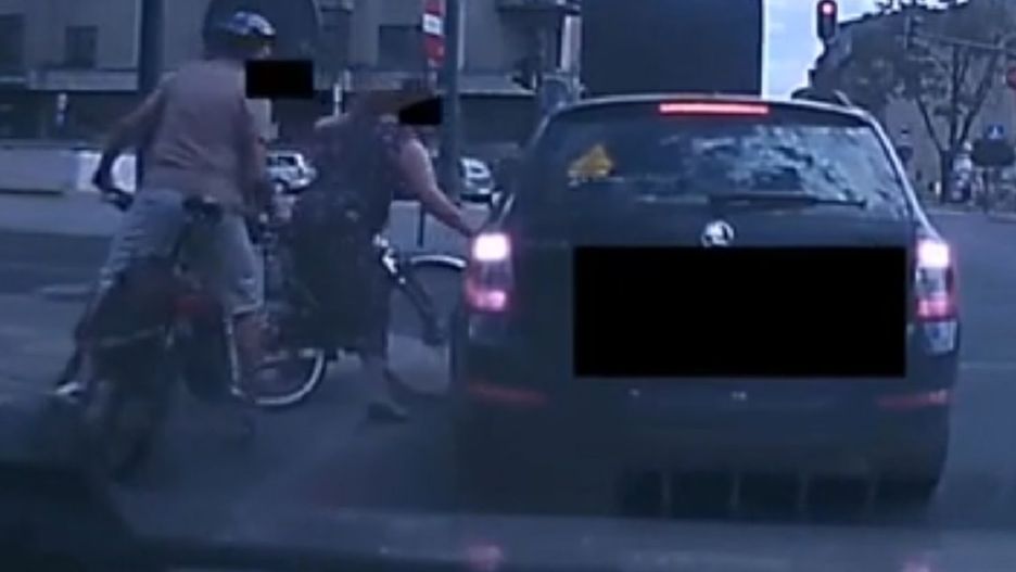 Łódź, środek lipcowego dnia. Przez skrzyżowanie w centrum miasta przejeżdża na zielonym świetle sznur samochodów. Przed czarną Skodą zapala się czerwone światło. Nie ma miejsca, musi zatrzymać się na przejeździe rowerowym. Paru cyklistów objeżdża zajmujący częściowo ich pas wóz, ale jeden mężczyzna (wiozący na przyczepce dziecko) zaczyna obijać go pięścią. Gdy kierowca do niego wychodzi, zaczyna się kłótnia. Do rowerzysty z dzieckiem dołącza się kobieta, która najpierw także obija samochód, a następnie szarpie za klamki i kopie pojazd. Pomaga jej w tym kolejny rowerzysta.