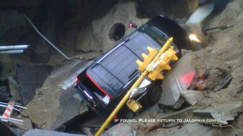 Serwis Jalopnik opublikował zdjęcie, które podesłał czytelnik. Zdjęcie przedstawia wielką dziurę, a w zasadzie zapadlisko które pojawiło się w Północnym Milwaukee. Było na tyle ogromne, że połknęło sygnalizację świetlną oraz niemałego przecież Cadillac'a Escalade. Kierowca auta nie odniósł poważnych obrażeń, i chyba udało mu się nawet uciec przed samym zdarzeniem na bezpieczną odległość.