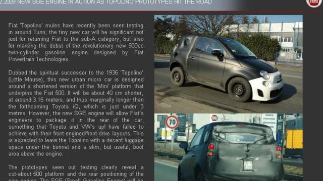 Podczas wystawy branżowej Genewa 2010 Fiat zamierza zaprezentować ciekawy samochód prototypowy. Będzie to Fiat Topolino - mały włoski pojazd, który swoją platformę będzie dzielił m.in. z popularnym modelem 500. W ostatnim czasie na ulicach Turynu pojawiły się sztuki testowe. Samo auto swoją konstrukcją nawiązuje do zaprezentowanego w 1936 roku modelu, który wówczas traktowany był jako jeden z najmniejszych na świecie samochodów.