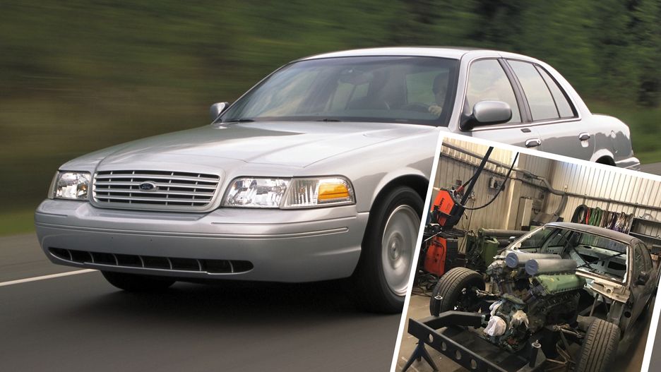 Ford crown victoria z silnikiem z czołgu. Jednostka ma 27 l pojemności