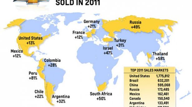 Ogromny wkład w sukces koncernu z Detroit miał Chevrolet, który zanotował na poszczególnych rynkach kolosalny wzrost sprzedaży. Najlepiej było w Tajlandii, gdzie salony Chevy opuściło o 58% więcej aut niż w roku 2010. 49-procentowy wzrost w Rosji i łączna sprzedaż 173 485 na tym obszarze także jest powodem do dumy, nadal jednak zdecydowanie najwięcej Chevroletów znajduje swoich nabywców w Stanach Zjednoczonych. Tylko w zeszłym roku sprzedano tam o 13% więcej aut osiągając wynik 1 775 812 egzemplarzy.