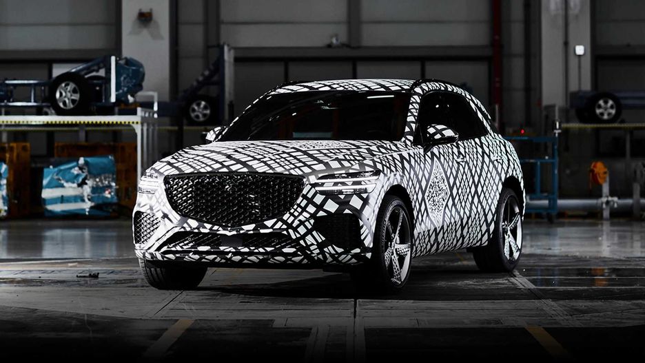 Mocno zakamuflowane nadwozie skrywa ostre rysy przyozdobione nowoczesnym oświetleniem LED i dużą atrapą chłodnicy. Wizualnie auto powinno więc prezentować się jak pomniejszony GV80. Będzie też do niego podobne w kwestiach technicznych.