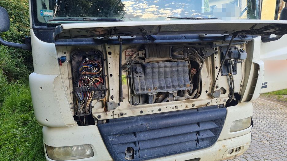Szczegółowy przegląd stanu technicznego wykazał szereg nieprawidłowości. Już na początku, po podłączeniu urządzeń diagnostycznych, na jaw wyszła obecność nielegalnego emulatora układu oczyszczania spalin. Stwierdzono też błędy w działaniu oświetlenia, w tym całkowity brak świateł stop w ciągniku oraz rozbity reflektor.