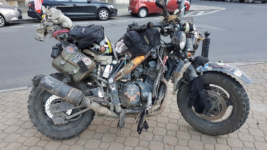 Indywidualizacja pojazdów przybiera czasem niesamowite formy. Jedni pucują swoje auta lub motocykle tak, że można się w nich przejrzeć, a inni obierają przeciwny kierunek. W tym przypadku napis na motocyklu mówi wszystko. To "haniebnie ubrany jednoślad".
