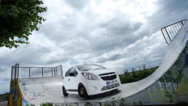 Jest ukryty pod podwoziem, bo Niemcy zainstalowali w nim regulowane zawieszenie firmy H&R. Z zewnątrz o sportowych zapędach Sparka mają świadczyć 17-calowe czarne felgi z oponami 185/35 R 17.