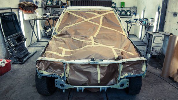 Dodatkowo taśmę warto nakleić również z zewnątrz na ukos, aby wzmocnić papier przed silnym strumieniem farby z pistoletu lakierniczego. W drzwiach kierowcy w papierze został wycięty otwór techniczny, żeby był dostęp do kierownicy podczas przepychania auta. Jest ono w pełni jezdne, ale po zapaleniu silnika wiatrak chłodnicy w najlepszym przypadku szybko poradziłby sobie z papierowym maskowaniem.