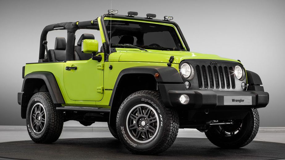 Zacznijmy od jaskrawozielonego Wranglera, który został ubrany w zestaw MoparOne obejmujący nie tylko ciekawy lakier, czy wnętrze wykończone czarną skórą, ale również modyfikacje techniczne. Auto wyróżnia się prześwitem zwiększonym o 5 cm, zmodyfikowanym układem kierowniczym i 17-calowymi felgami, na które naciągnięto terenowe opony Hankook.
