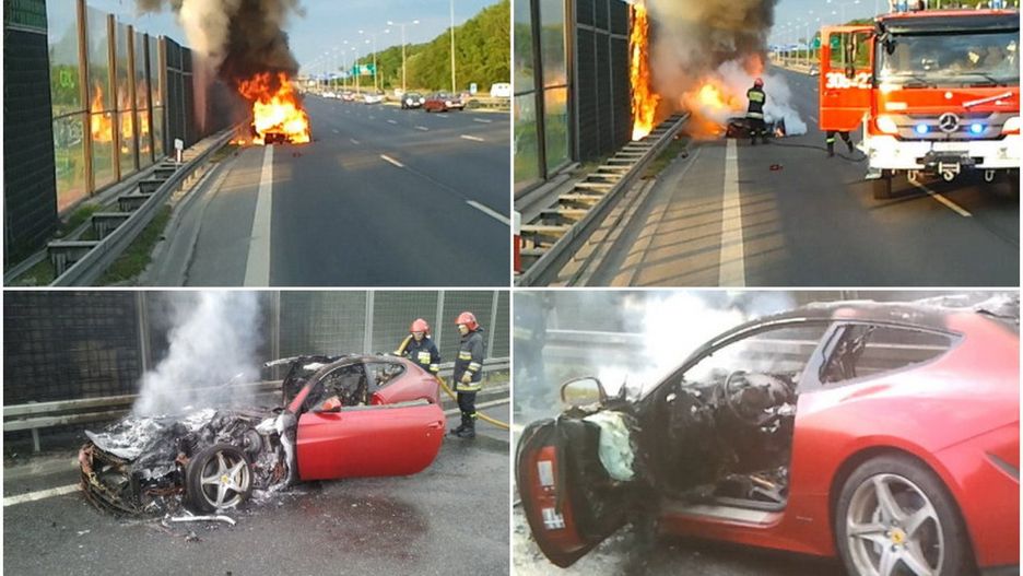 Wszystko miało miejsce wczoraj późnym popołudniem (zgłoszenie dotarło do Państwowej Straży Pożarnej o godzinie 19:23). Mimo starań dwóch zastępów straży pożarnej i przejeżdżających kierowców samochód spalił się niemal doszczętnie. Nikomu nic się nie stało, przyczyny pożaru auta nie są znane, ale z zeznań wynika, że ogień pojawił się w czasie jazdy samoistnie, w okolicy pedałów, po czym rozprzestrzenił się na resztę auta. To już trzecie Ferrari FF, w którym doszło do samozapłonu.