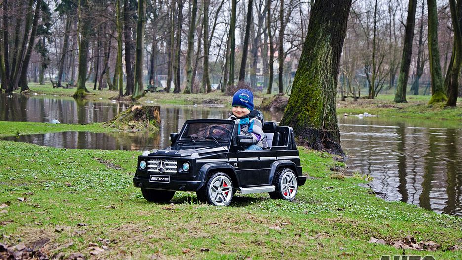 Testowaną Gelendą zdecydowanie przyjemniej jeździ się po bezdrożach. Napęd na jedną oś nie jest dużym problemem, ale przyznam, że 4x4 robiłoby tu niezłą robotę. Nie jest problemem również mechanizm różnicowania prędkości obrotowej obu kół. Działa jak LSD więc nawet na dużych nierównościach nie ma większych problemów z trakcją. Możliwe jest nawet ruszenie z miejsca, gdy jedno z kół napędowych wisi w powietrzu, więc jest lepszy od LSD. Brak zawieszenia Mercedes nadrabia dość agresywną rzeźbą bieżnika, zapewniającego mu dobrą trakcję. Nie ma problemów w błocie, na piachu i mokrej trawie. Trochę trudniej jest na liściach i w kopnym piachu, gdy silnikom zaczyna brakować mocy. To jest właściwie jedyny problem na podjazdach na miękkim podłożu, choć trzeba przyznać, że ten pojazd jest zaskakująco dzielny podczas pokonywania wzniesień. Na tych przeznaczonych dla wózków daje sobie radę bez trudu, nawet jeśli silniki stękają tak, jakby za chwile miały się wykończyć. Średniej wielkości górki, z których dzieci jeżdżą na sankach też nie stanową problemu. Ostatnio nawet pod taką podjechałem… podobno zasnąłem w połowie.