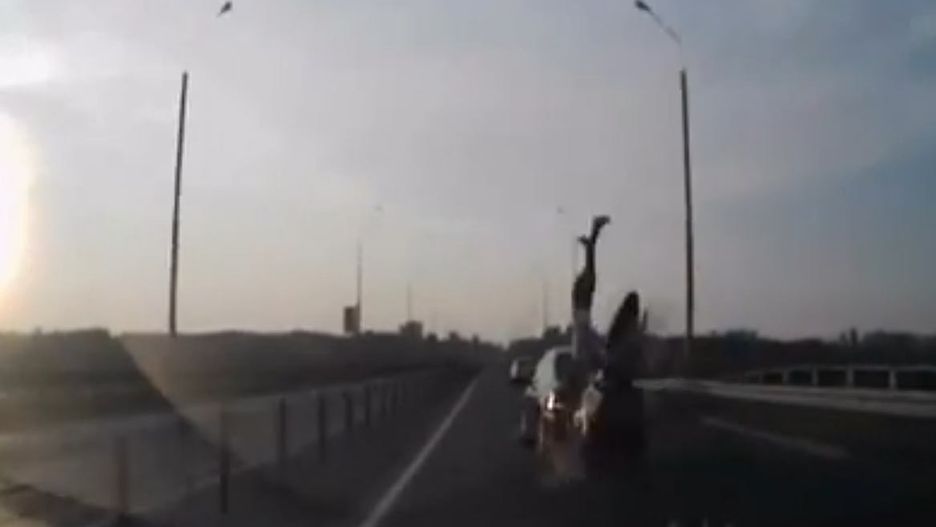 Motocyklista na dachu samochodu