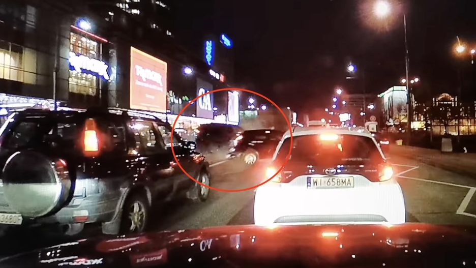 Nagranie z karambolu w Warszawie. Pędził torowiskiem, wbił się w auta stojące w korku