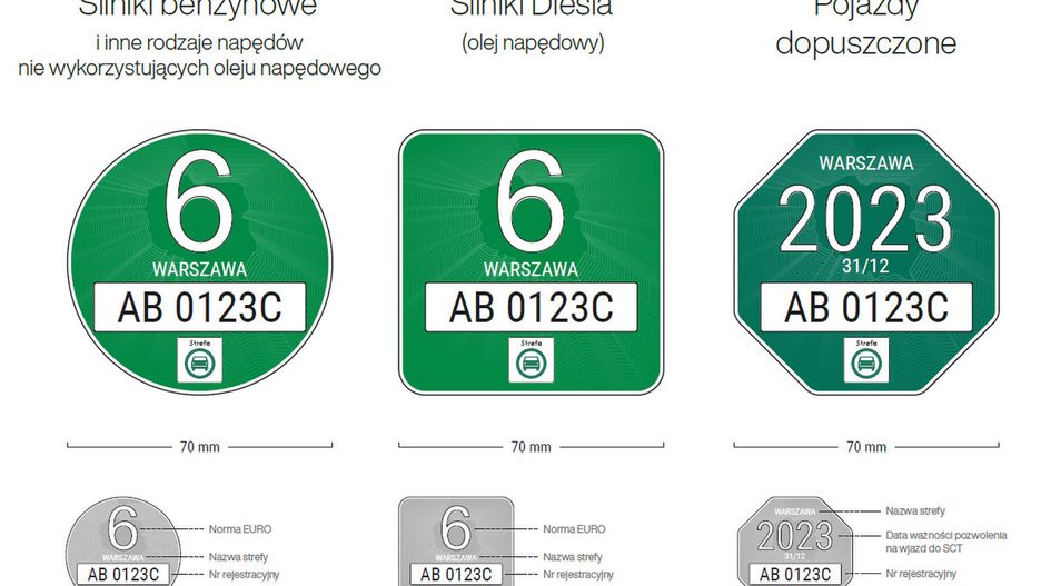 Pojazdy dopuszczone do poruszania się w strefie według klucza innego niż spełniana norma emisji spalin otrzymałyby naklejkę w formie ośmioboku z nazwą miasta obowiązywania, datą ważności i numerem rejestracyjnym.
