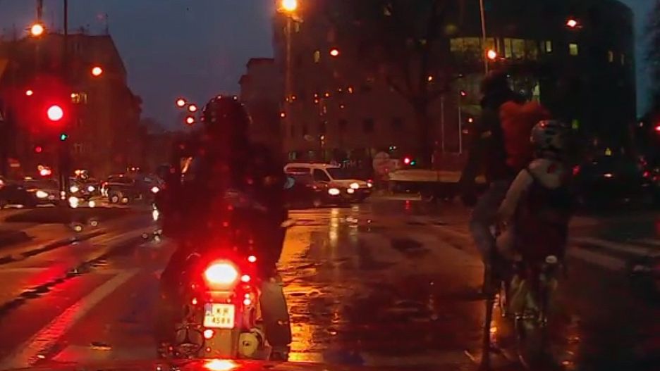 Ciemno, mokro, duży ruch - czy jakikolwiek z tych czynników mógł powstrzymać tego głupca przed wjechaniem z dzieckiem na skrzyżowanie na czerwonym świetle? Jak widać na filmie - nie. Na dodatek rower nie ma jakiegokolwiek oświetlenia.