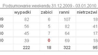 Mamy mały sukces. Po raz pierwszy od 10 lat policja polska nie odnotowała żadnej ofiary śmiertelnej na drogach podczas minionej niedzieli. Choć wypadków było dość sporo, bowiem aż 39, to nikt z nich nie zginął. Liczba ofiar rannych wyniosła 69 osób. Również nietrzeźwych było mniej niż w latach ubiegłych. Wygląda więc na to, że poskutkowały policyjne apele.