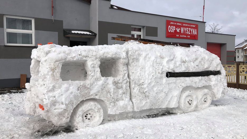 Zimowa aura sprzyja tworzeniu wyjątkowych budowli. Strażacy z OSP w Wyszynie podeszli do tematu niekonwencjonalnie - zamiast igloo czy bałwana ulepili wóz strażacki, który - gdyby tylko jeździł - mógłby zastąpić ich wysłużonego stara.
