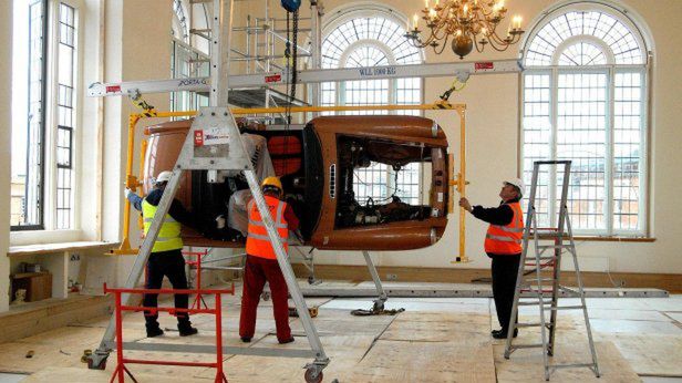 Auto zostało więc pozbawione silnika, drzwi oraz przedniej szyby, a następnie umieszczone w specjalnym stelażu. Całość uniesiono do góry przy pomocy podnośnika, który jest w stanie unieść 30 ton. Pojazd wjechał do środka na specjalnej szynie, cała operacja miała miejsce 1 grudnia, a odpowiada za nią British Motor Heritage, czyli firma, która przez lata produkowała części karoserii do brytyjskich roadsterów.