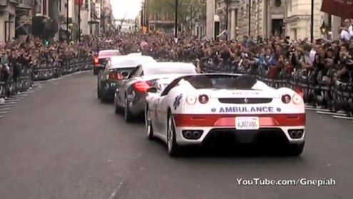 Na starcie uczestnicy musieli odbyć rundę honorową i zaprezentować się publiczności, a było co oklaskiwać. Na 17-minutowym filmie poniżej możemy zobaczyć takie rodzynki jak: Mercedes SLR Stirling Moss, Ferrari F430 Spider Ambulance, Rolls Royce Phantom, Bugatti Veyron, kilka 599 GTB, Gallardo czy chociażby Murcielago z bagażnikiem dachowym.