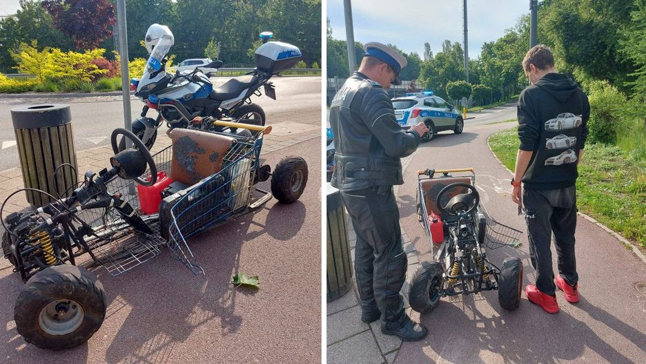 Funkcjonariusze zatrzymali młodzieńca. Jak się okazało, 19-latek samodzielnie skonstruował pojazd, wykorzystując wózek sklepowy, silnik o pojemności 50 cm sześciennych oraz garść innych części. Jak widać na zdjęciach, które wykonali policjanci, pojazd miał nawet przednie zawieszenie ze sprężynami i amortyzatorami. O ile konstrukcja mogła wzbudzić entuzjazm policjantów, to już sposób jej użycia na pewno nie.