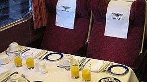 To tak na marginesie. Prawdziwą sensacją dnia jest ekskluzywny przedział w wynajętym specjalnie na tę okazję pociągu. Przecież najlepsi klienci Bentleya, oraz najefektowniej pracujący dealerzy muszą podróżować w godziwych warunkach, prawda? Mam tutaj na myśli warunki standardowe dla posiadaczy samochodów tej marki. No a 2,5 godzinna podróż z Londynu do miejsca przeznaczenia musi zostać odpowiednio umilona.