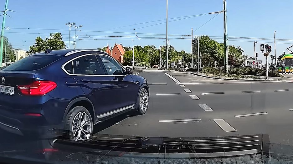 Sytuacja została nagrana przez wideorejestrator w aucie kobiety, a następnie została upubliczniona na kanale Bandyta z Kamerką. Na wideo widać skrzyżowanie w Poznaniu, na którym samochód, z którego pochodzi nagranie, stoi na pasie do jazdy prosto lub w prawa. Pas po lewej stronie nakazuje jazdę prosto, lecz na środku skrzyżowania nagle skręca z niego BMW X6. Potem jednak robi się jeszcze dziwniej.