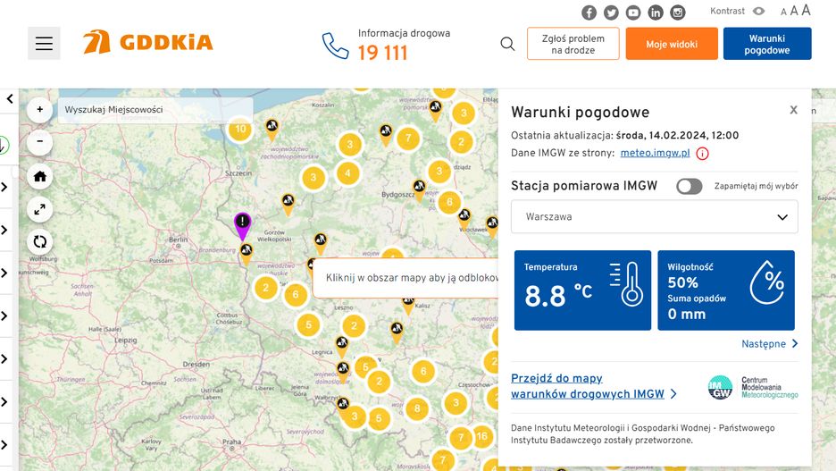 Kierowcy mogą wybierać spośród wskazań 60 stacji pomiarowych funkcjonujących w całym kraju. Bezpośrednio z widżetu można przejść również do bardziej precyzyjnych map IMGW prezentujących warunki na danym odcinku dróg krajowych.