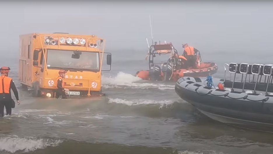 Ciężarówka zanurzona w morzu do wysokości drzwi to niecodzienny widok, który kilka dni temu można było podziwiać na jednej z plaż w Kołobrzegu. To spektakularna akcja Brzegowej Stacji Ratownictwa, mająca na celu odholowanie łodzi z mielizny.