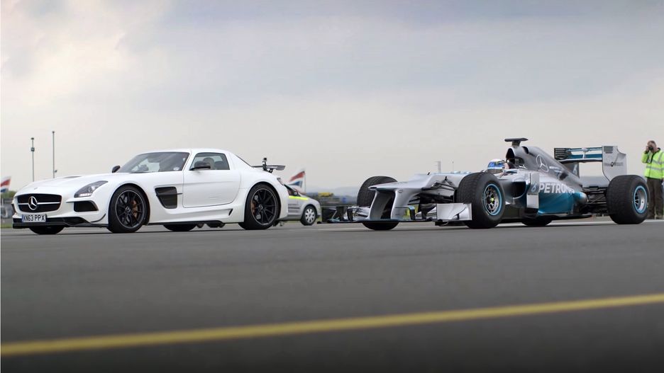 Mercedes SLS AMG Black vs F1 car - Drag Race Shoot-out