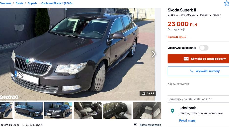 Rząd usilnie walczy z problemem handlarzy cofających liczniki w samochodach, ale w tym wypadku nie podstaw, by nie wierzyć właścicielowi. Nie ma mowy o korekcie przebiegu, bo w ogłoszeniu sprzedaży czarnej škody superb z 2008 roku wyraźnie jest napisane, że auto przejechało 808 235 km. Tak duży przebieg został "nabity" na trasie Szczecin - Berlin. Auto służyło w firmie, która dowoziła gości na lotniska.
