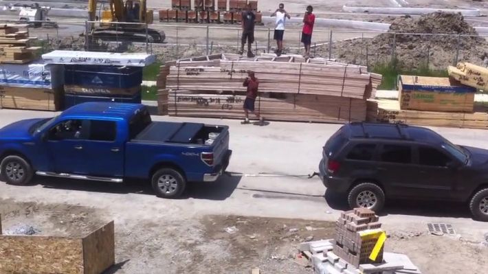 Zwykle przeciąga się linę ręcznie lub traktorami, ale tu trzeba było wyjaśnić, czy silniejszy jest Jeep Grand Cherokee na terenowych oponach czy potężny Ford F-150 na standardowym ogumieniu.