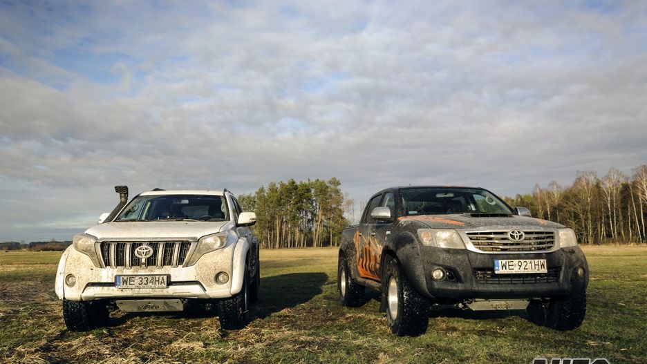 Jego napęd jest tak sprawny, że w standardowym ustawieniu robi wszystko to, co Hilux z dołączonym przodem, a nawet więcej. Land Cruiser zdecydowanie nadrabia również trakcją, którą zawdzięcza zawieszeniu. Duży skok koła i wykrzyżowanie osi pozwala ze spokojem i lekkością przemierzać nawet najgłębsze dziury w polnej drodze, którą poruszają się tylko traktory. W tym czasie kierowca Hiluxa przeklina pod nosem. Land Cruiser ze stałym napędem 4x4 pozwala zapomnieć o jakichkolwiek blokadach, a przecież ma dwie. Zawieszenie umożliwia również jazdę po bezdrożach z prędkościami, które są nieosiągalne dla Hiluxa. Niestety w terenie Land Cruiser ma jedną wadę. Nie ma (przynajmniej my nie znaleźliśmy) wyłącznika czujników parkowania, które grają wysokotonową muzyczkę niemal bez przerwy. To drobiazg, ale jakże męczący.
