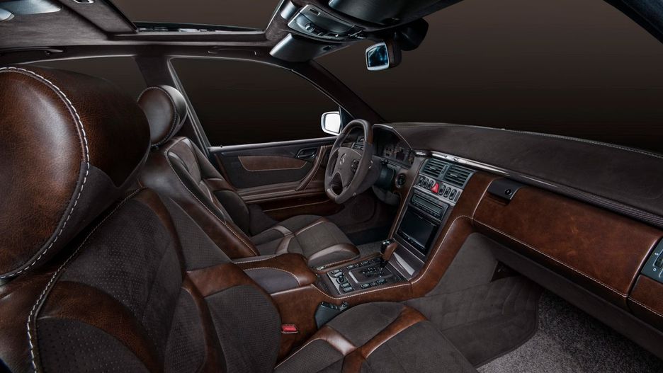 Od zewnątrz tuner był ostrożny. Zmienił jedynie felgi oraz przyciemnił okna. We wnętrzu natomiast dzieje się bardzo dużo. Zmieniono przede wszystkim kolorystykę auta. Jego wnętrze jest teraz mieszanką różnych odcieni brązu. Czekoladowe skóry w E55 AMG, w tym alcantara, wyglądają bardzo elegancko, a efekt wieńczą detale takie jak brązowe tła tarcz zegarów.