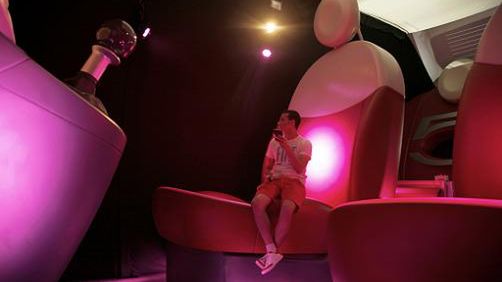 Na czym siedzi mężczyzna w krótkich spodenkach ze zdjęcia powyżej? Na fotelu. Jest to nic innego jak powiększony pięciokrotnie fotel Fiata 500, podobnie zresztą jak całe "pomieszczenie", w którym się znajduje. Może masz ochotę wspiąć się na deskę rozdzielczą?