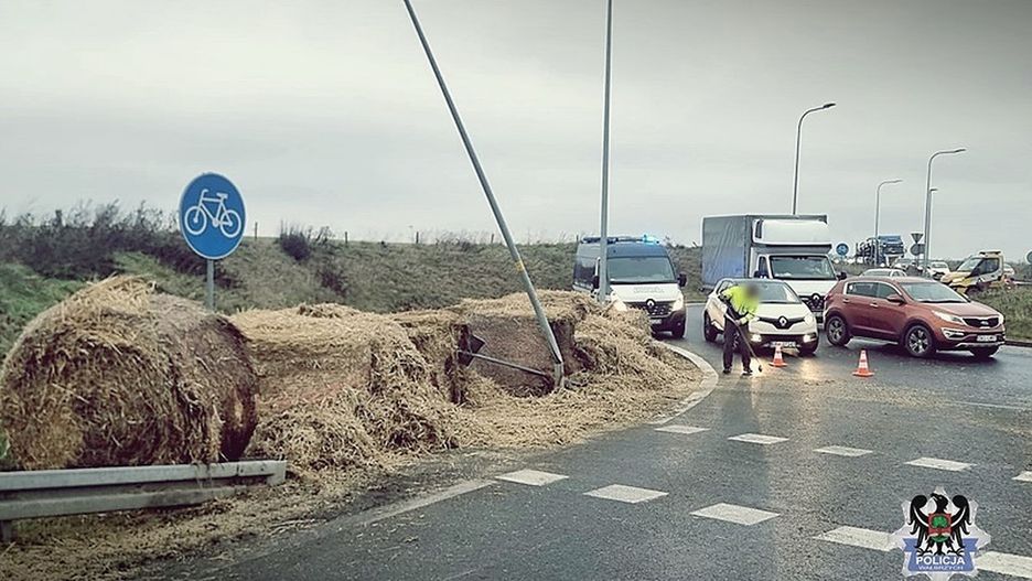 Do sporych utrudnień w ruchu doszło na terenie powiatu wałbrzyskiego, gdzie na rondzie w Starym Julianowie z przyczepy ciągnika rolniczego zsunęło się kilka balotów siana. Jak się okazało, kierowca pojazdu źle zabezpieczył ładunek. Doprowadził tym samym do zniszczenia infrastruktury drogowej.